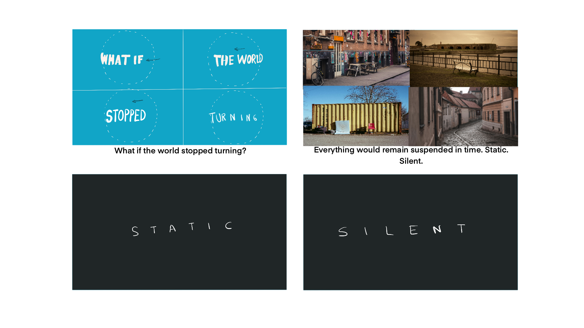 Nuestra aproximación creativa despegó con una pregunta fundamental y universal: ¿Y si el mundo corriera el riesgo de detenerse? Esta hipótesis sirvió como catalizador para el concepto de nuestra respuesta: un manifiesto colectivo.